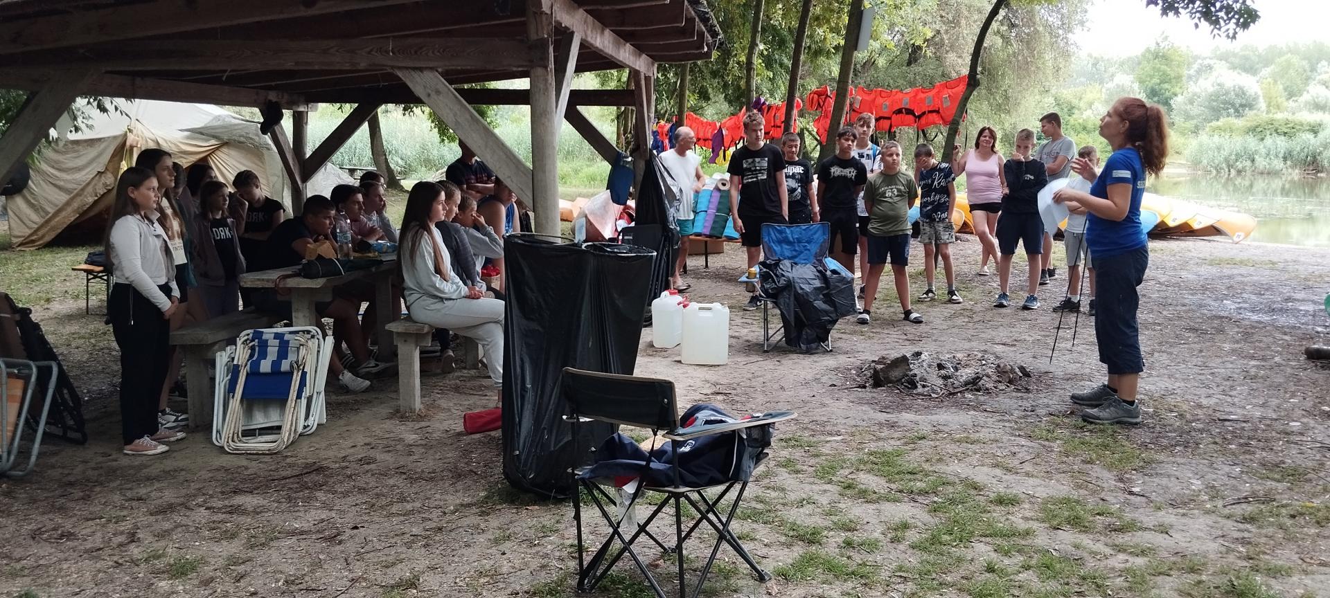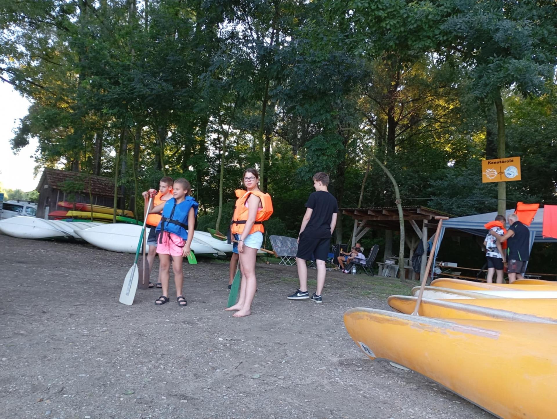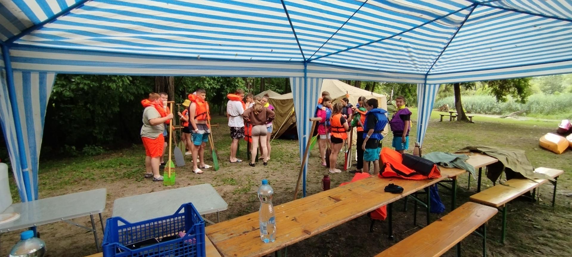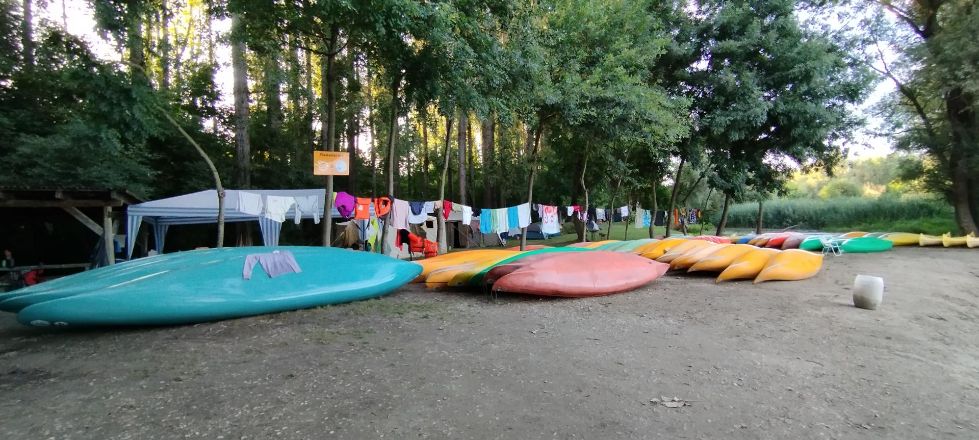 Megérkezésünk után enyhe esőben építettük fel sátrainkat majd megismerkedtünk a tábori élet szabályaival. A felszerelésünk (mentőmellény, evező) átvétele után elsajátítottuk a mentőmellény használatát és a kenuzás alapjait.