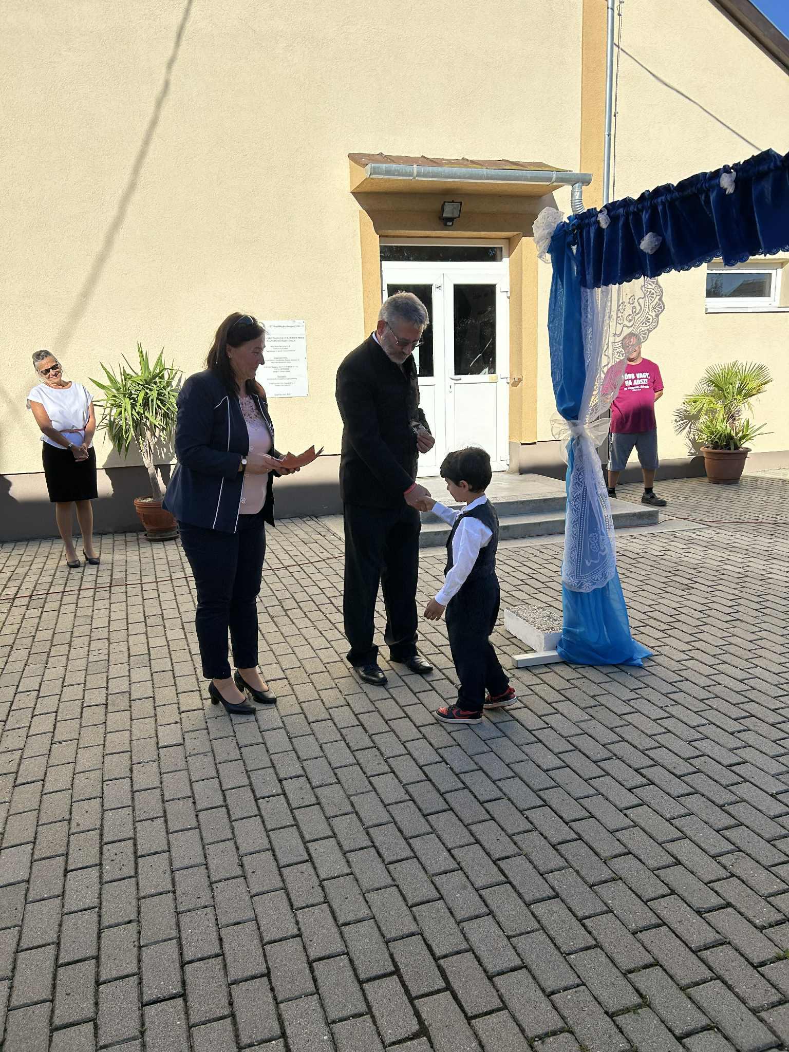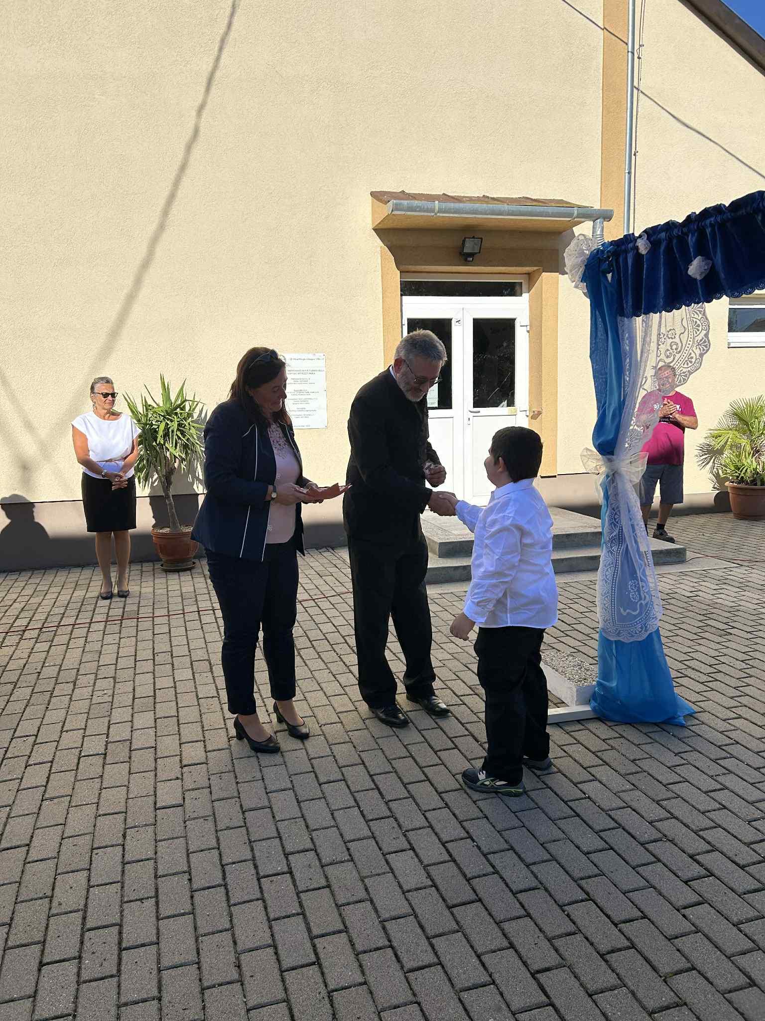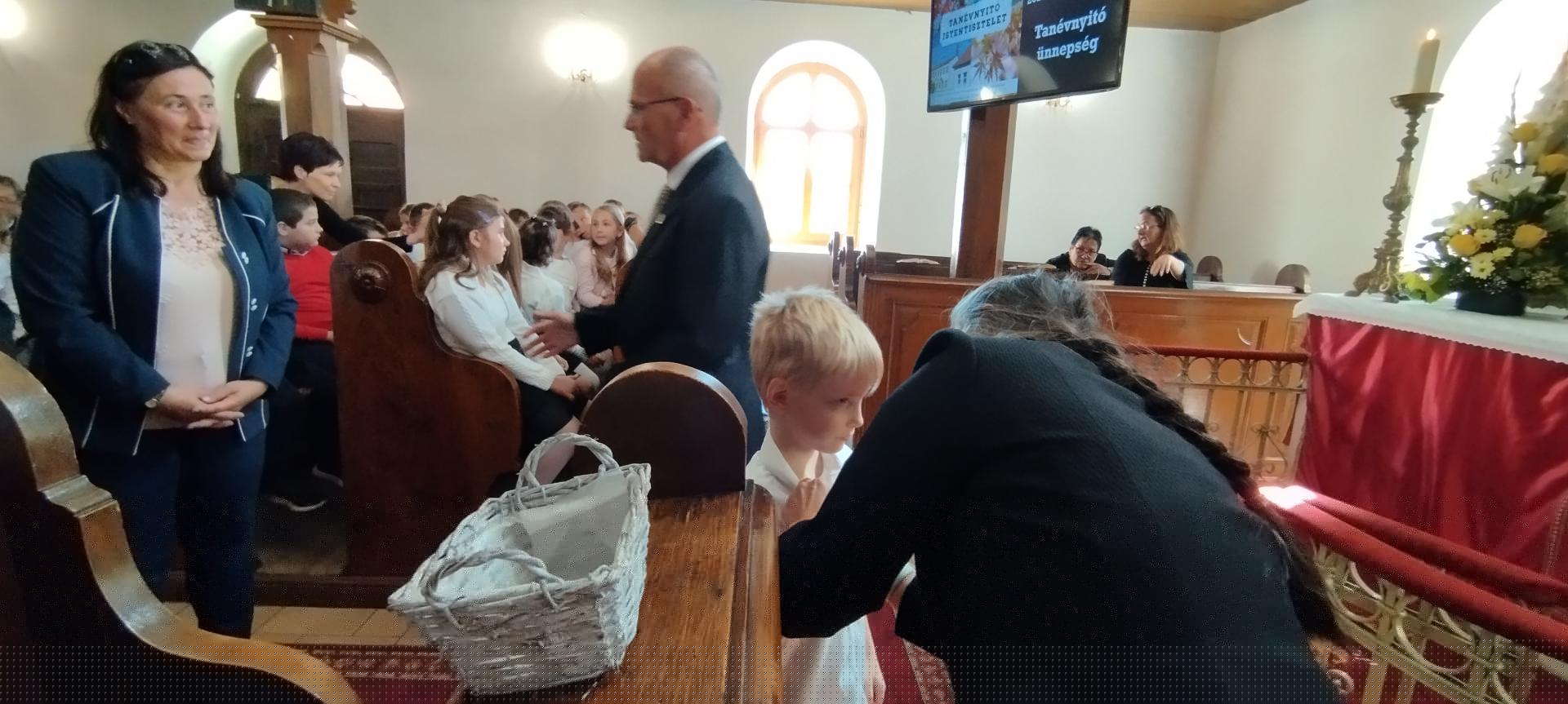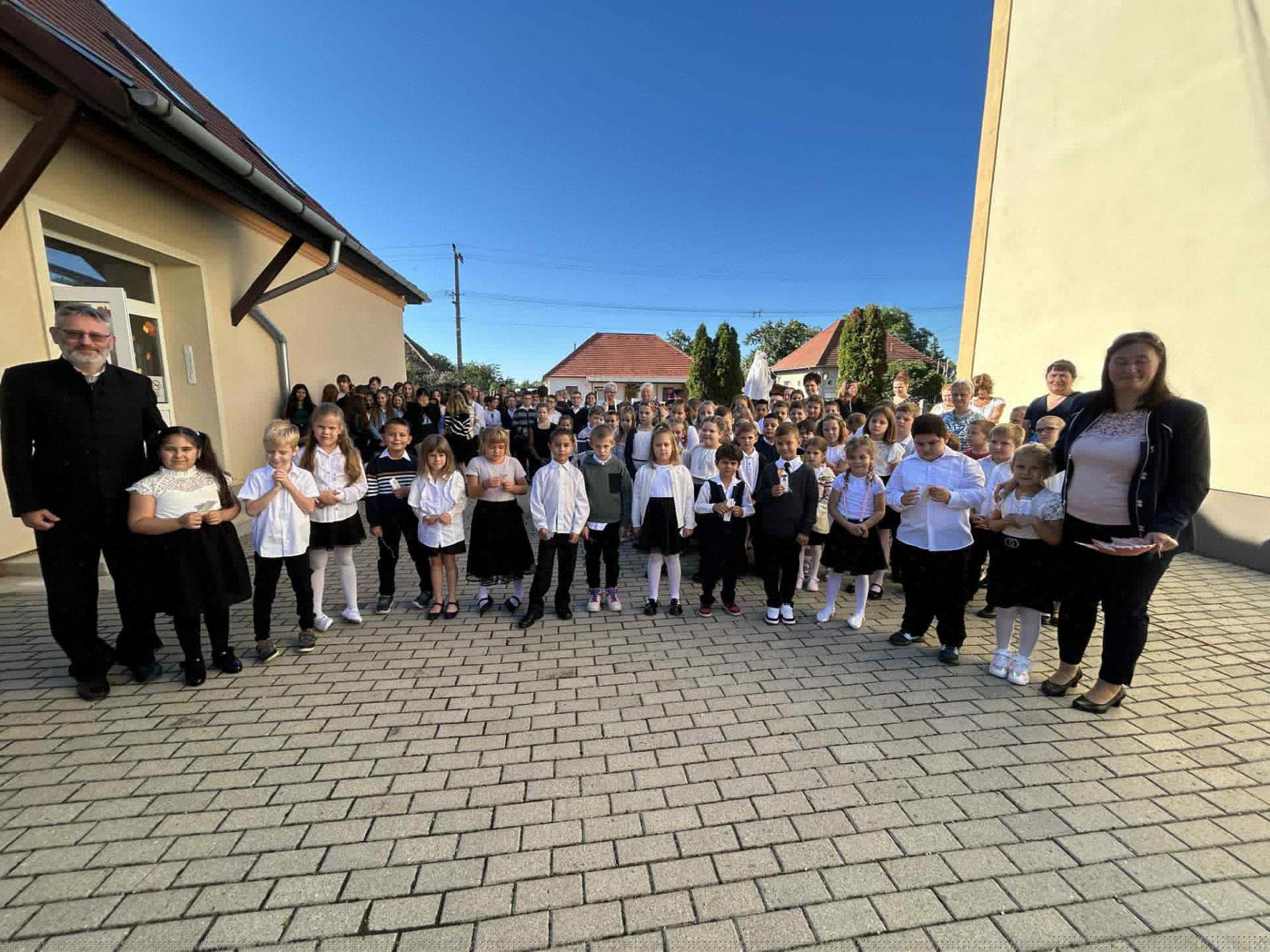 Ezt követően Sátory Károly igazgató kézfogással üdvözölte az 1. osztályosokat, akik megkapták Kurucz Krisztina intézményvezetőtől az iskola jelvényét. Az ünnepség végén az iskola és az egyházközség képviselői megkoszorúzták Döbrentei Gábor emléktábláját a templom falán.