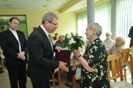 Margit néni 7 éve az otthon lakója, itt adta át neki Puskás Tivadar a miniszterelnök üdvözletét tolmácsoló emléklapot és egy csokor virágot. Az idős hölgy Egyházasrádócról származik, aktív korában könyvelőként dolgozott. Most is jó egészségnek örvend.