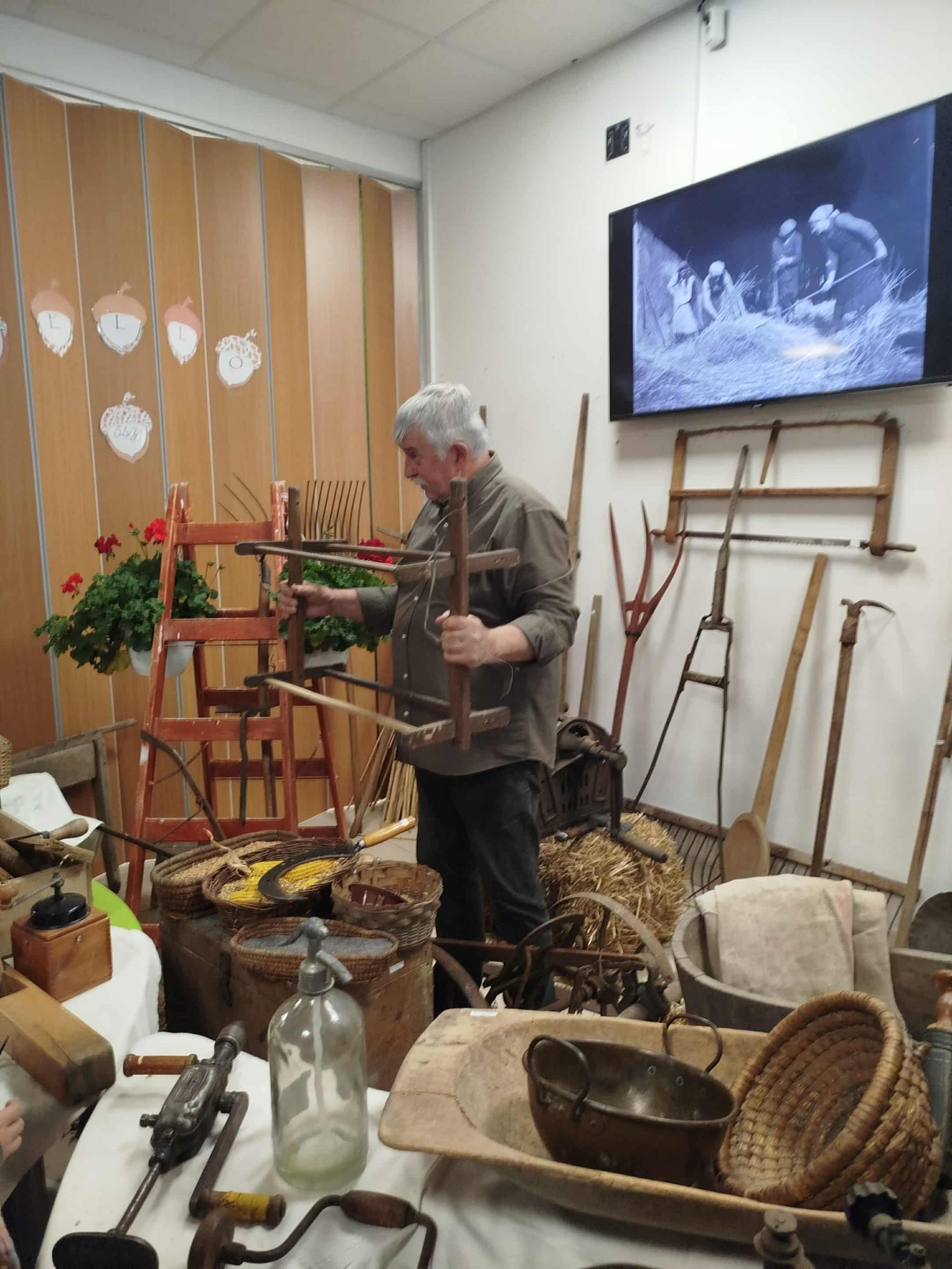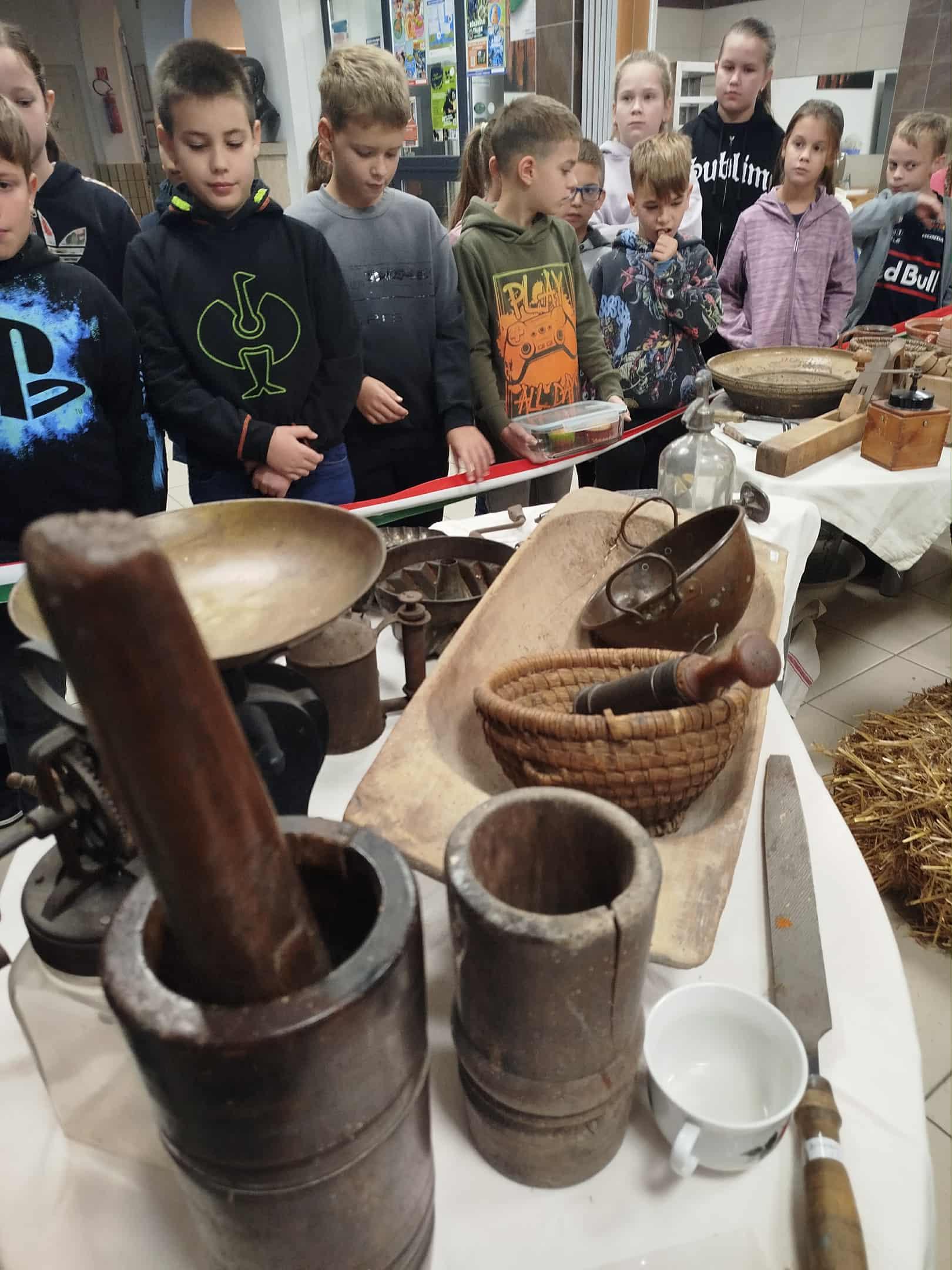 Az aulánkban idén is megtartottuk tematikus kiállításunkat a népi élet kincseiből, a gyerekek megismerhették a pajta funkcióját, tárgyait, eszközeit, betekintést kaphattak a learatott búza, rozs feldolgozásába. Ehhez idén Ferenczy Vilmos jött el hozzánk Karakószörcsökről, aki gyermekkori élményeit megosztva tanított mindannyiunkat. A kiállítás java részét is neki köszönhetjük, hiszen évek óta szívvel-lélekkel gyűjti felmenőinek kincseit. Nagy Endre muzeológus, a Vasi Skanzenből tett látogatást és megelevenítette kiállításunkat. A gyerekek ki is próbálhatták az eszközöket, beleképzelhették magukat a régi falusi gyermekek dolgos hétköznapjaiba. Külön köszönet Ferenczy Zsuzsának, hogy a kiállítást segítette berendezni, Petró Jutkának, és Szabó Attilának, aki pedig a tárgyak szállításában segédkezett.