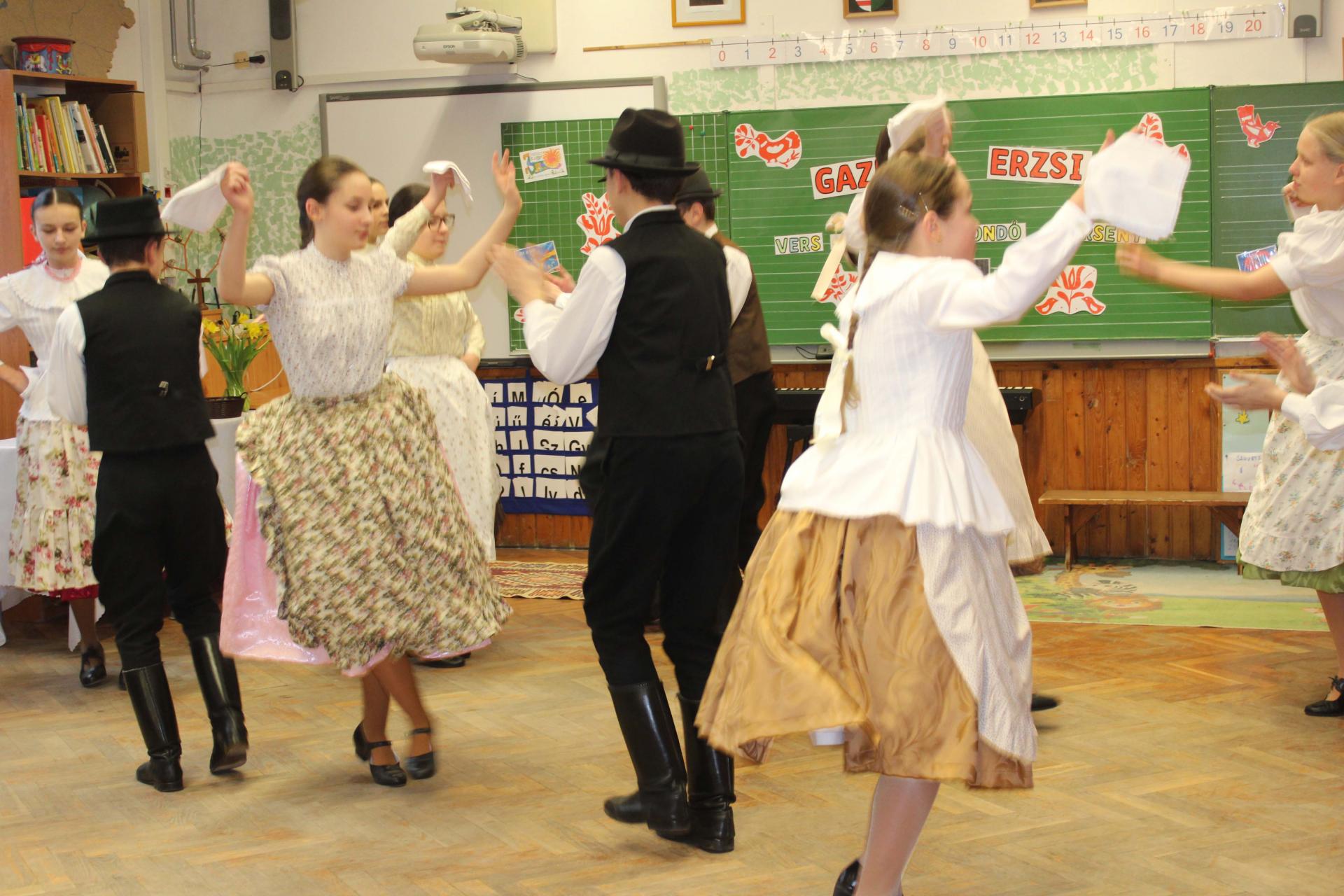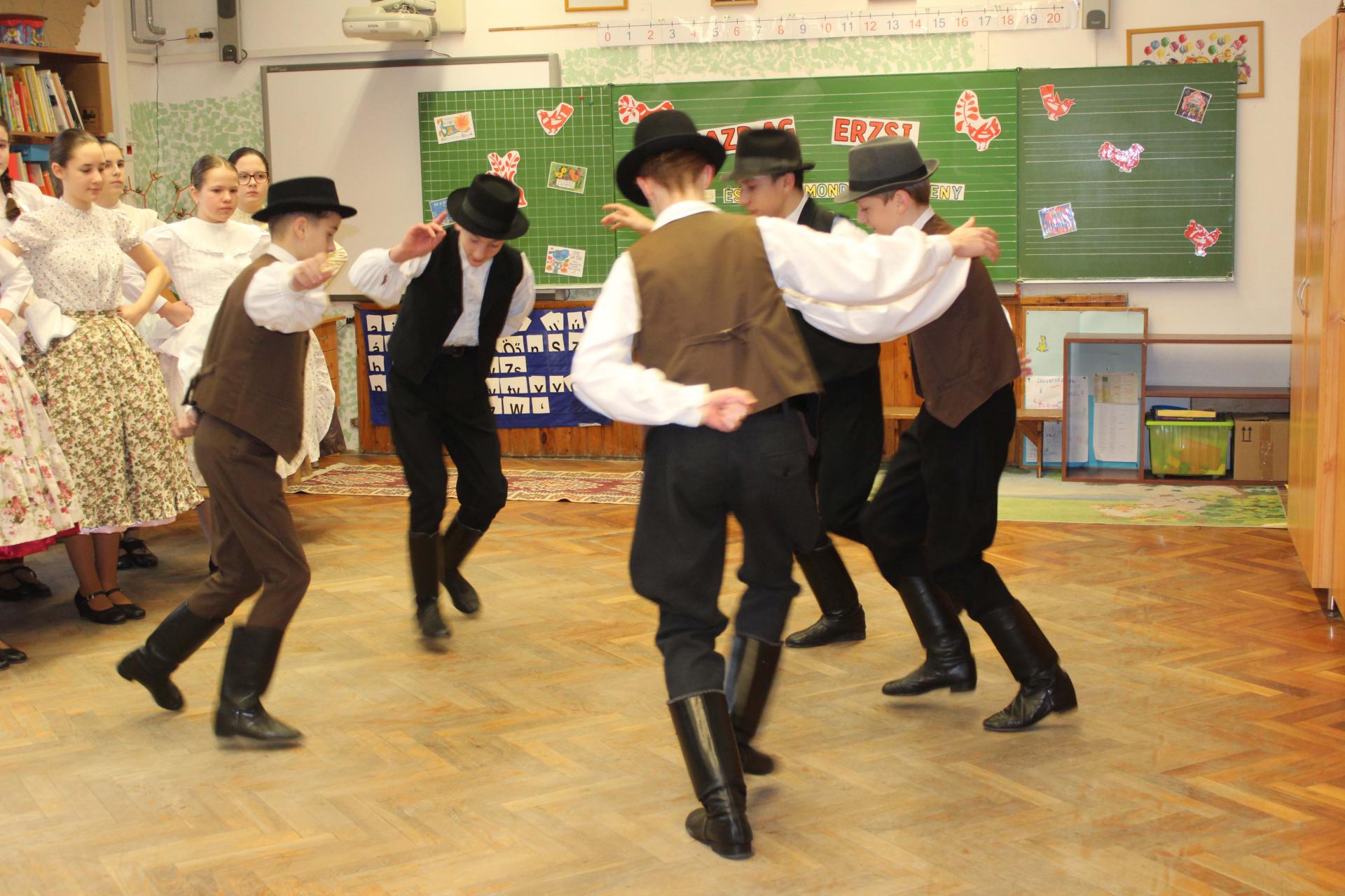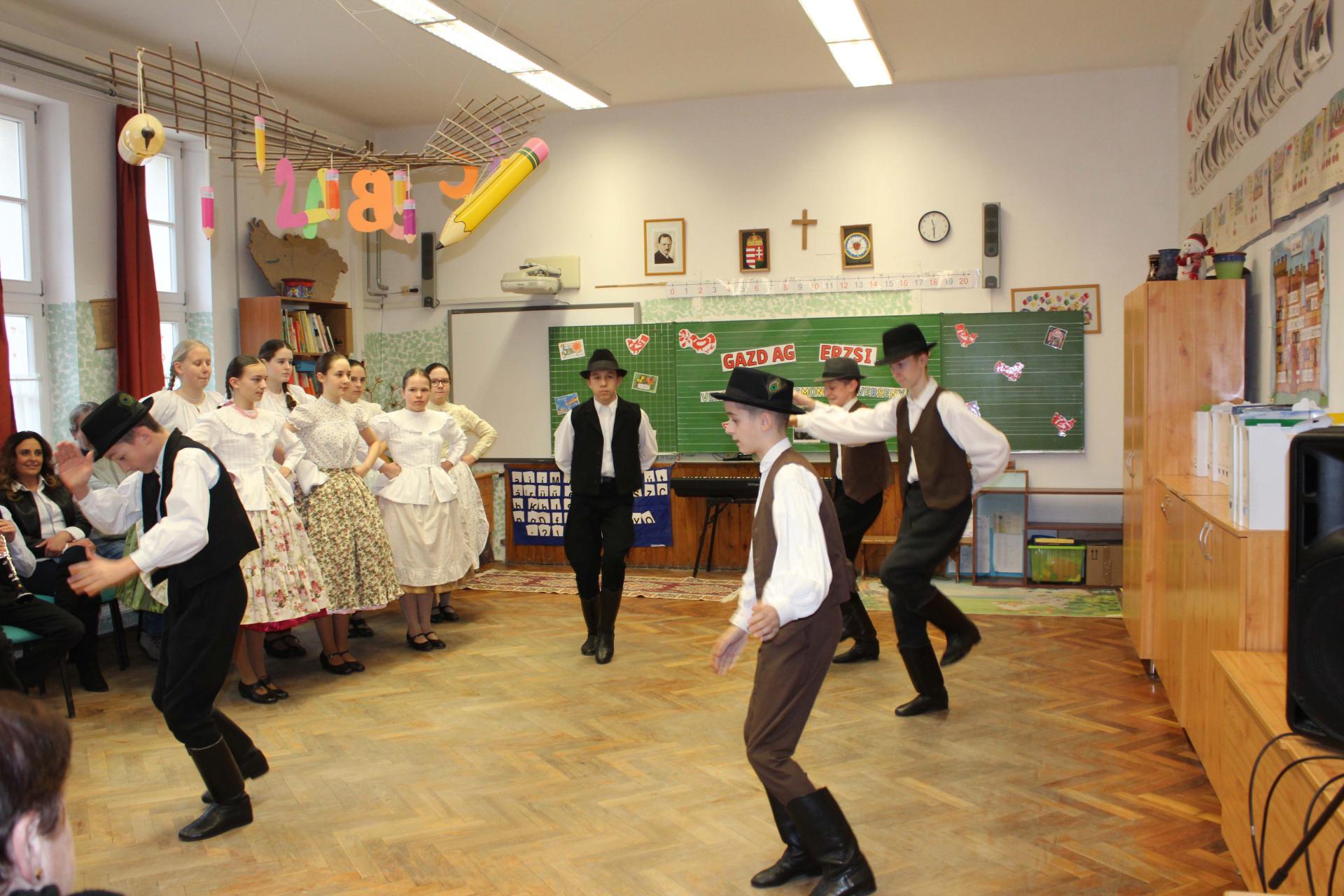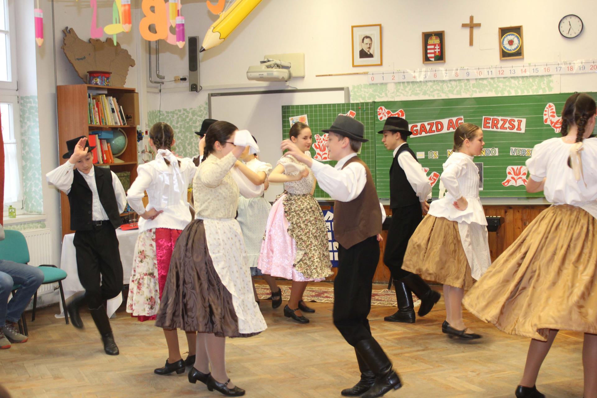 A rendezvényünket néptánccal is színesítettük: iskolánk Berbécs Néptánccsoportja a „Tyuhaj, sarkam, add föl a talpam!” című összeállítással vidám perceket szerzett a közönségnek.