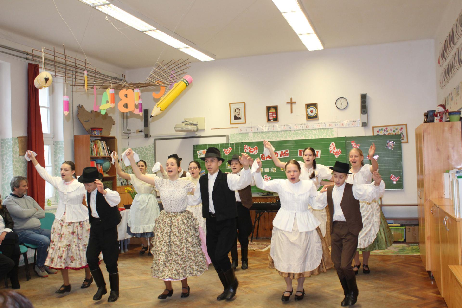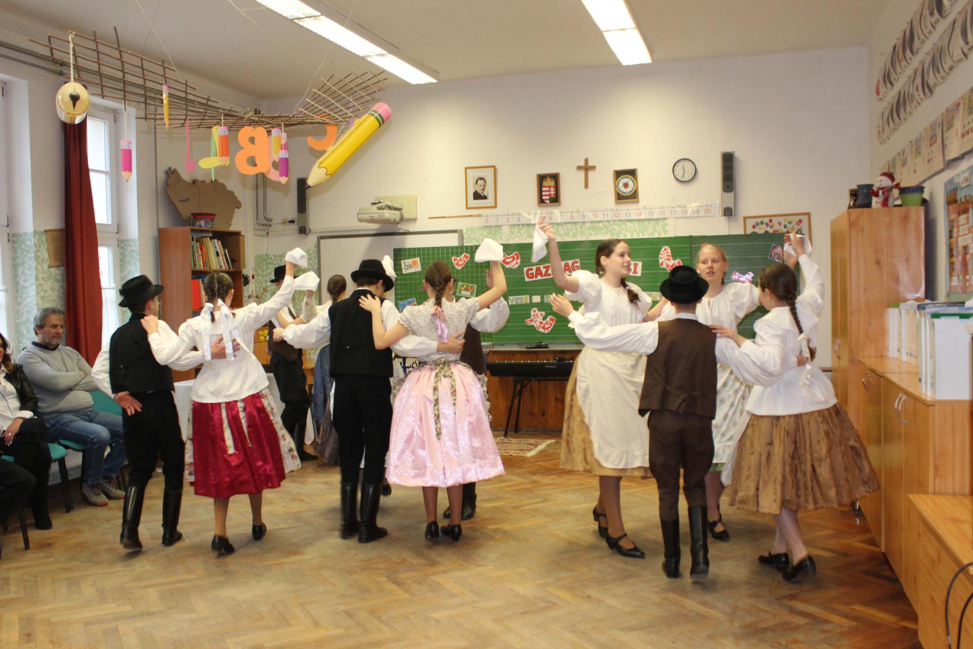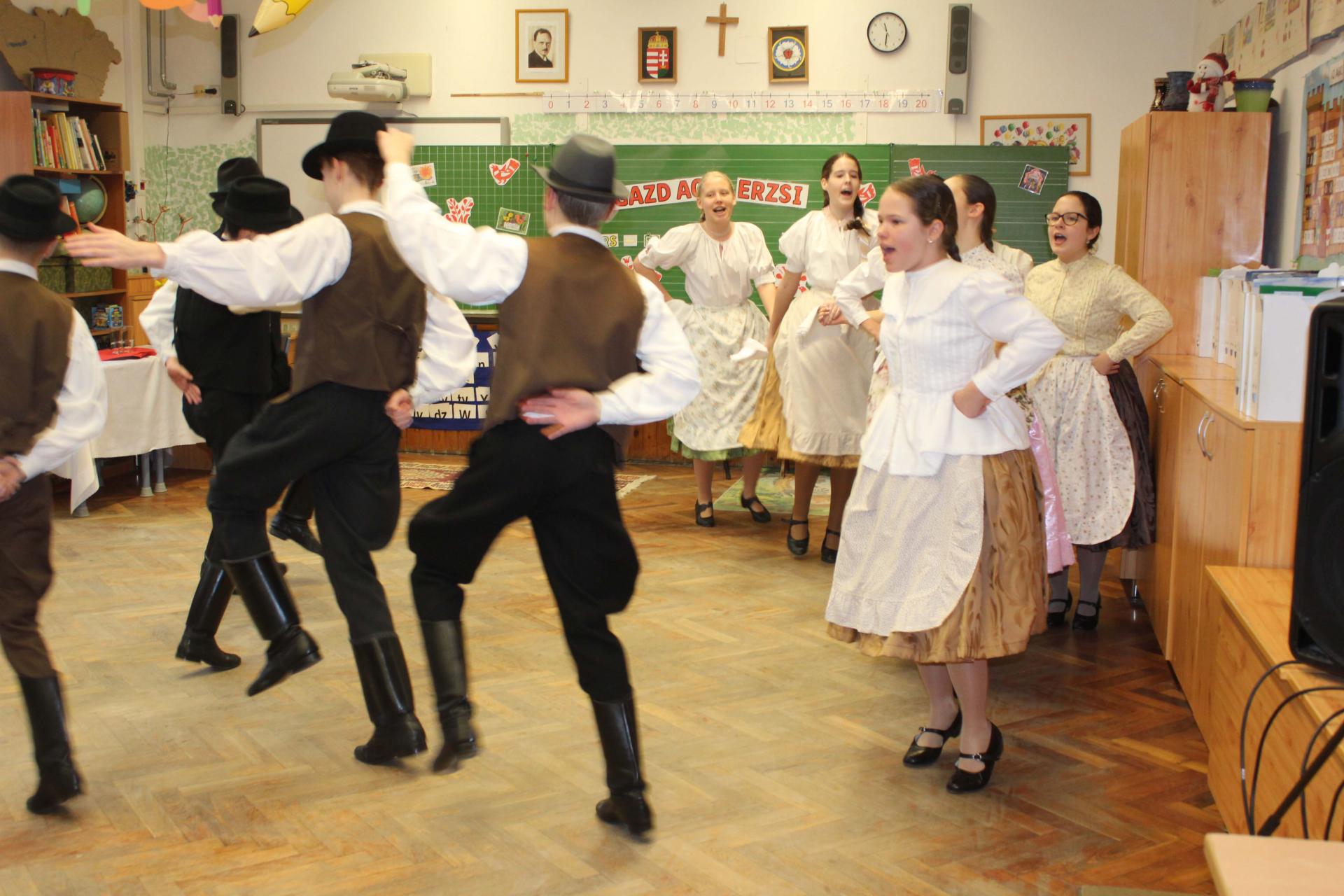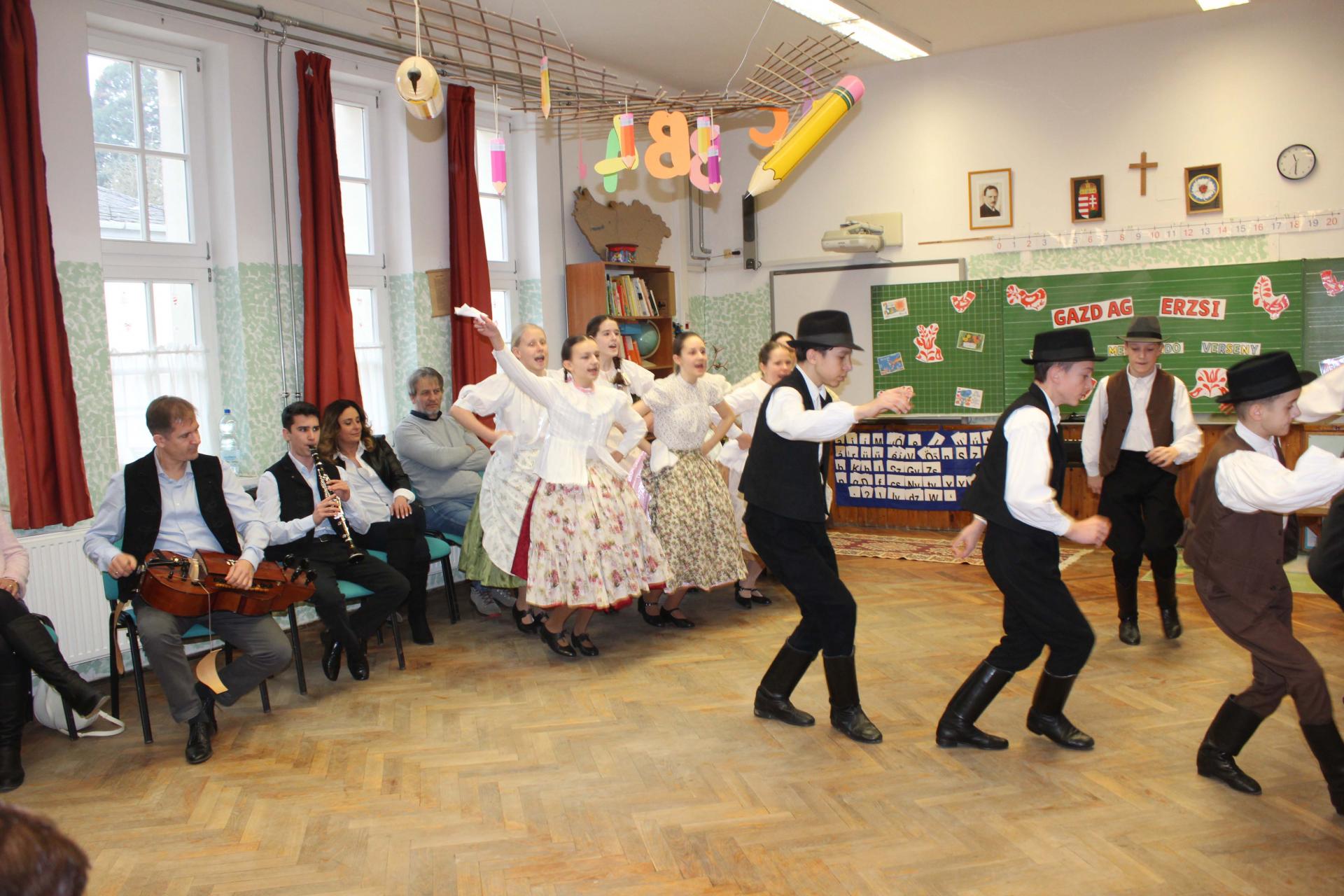A rendezvényünket néptánccal is színesítettük: iskolánk Berbécs Néptánccsoportja a „Tyuhaj, sarkam, add föl a talpam!” című összeállítással vidám perceket szerzett a közönségnek.