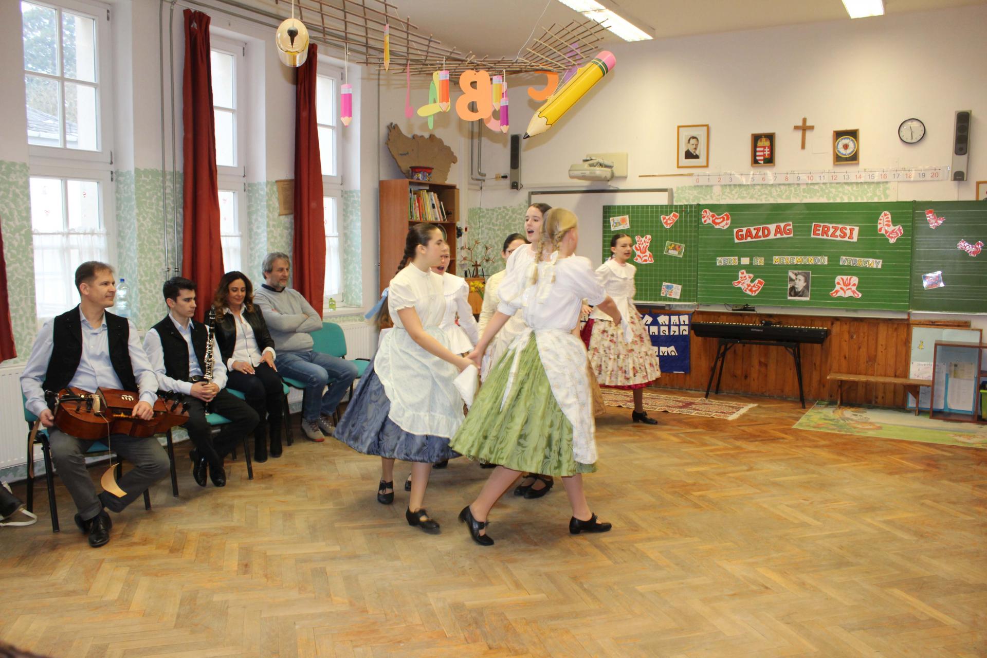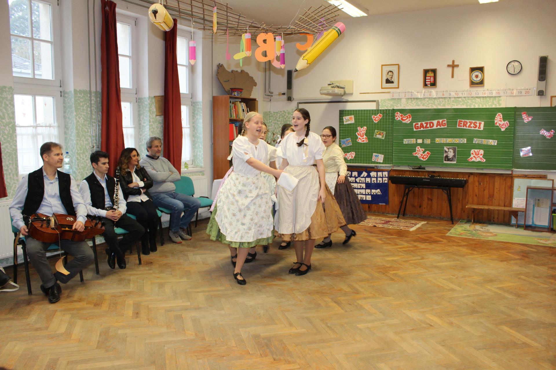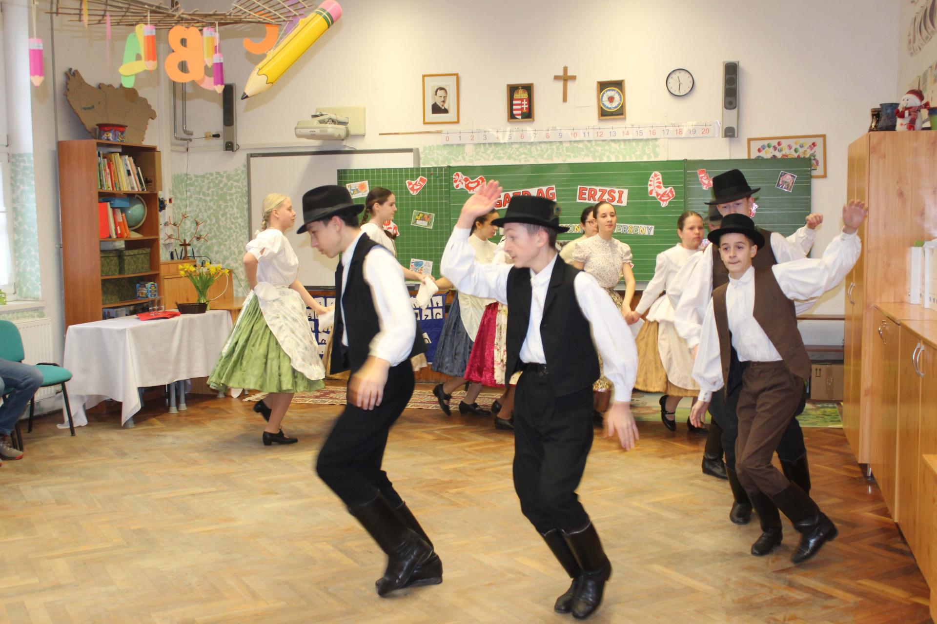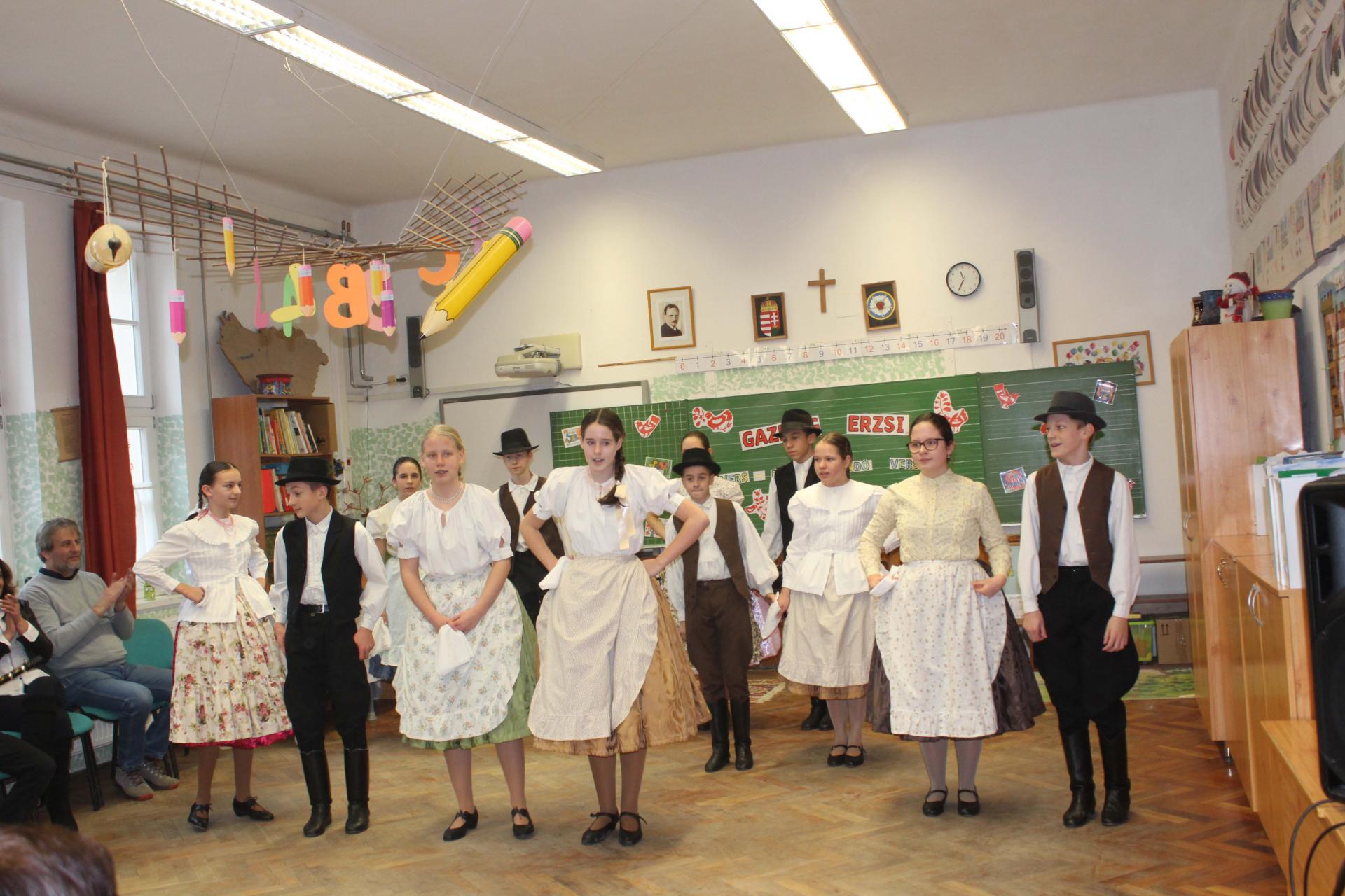 A rendezvényünket néptánccal is színesítettük: iskolánk Berbécs Néptánccsoportja a „Tyuhaj, sarkam, add föl a talpam!” című összeállítással vidám perceket szerzett a közönségnek.