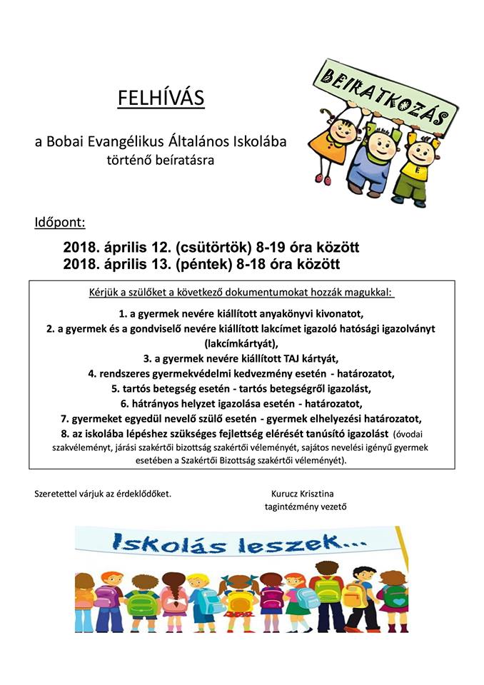 Bobai tagintézményünk április 12-13-án tartja beiratkozását. Részletek: