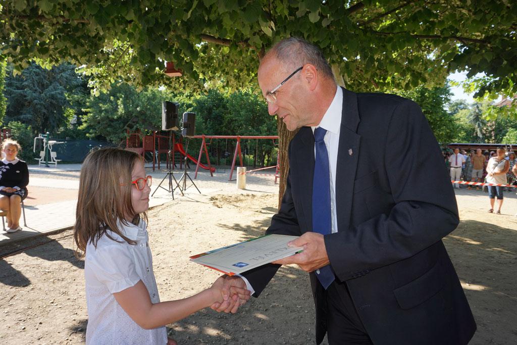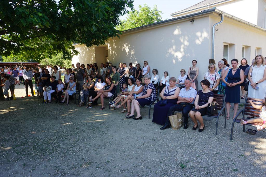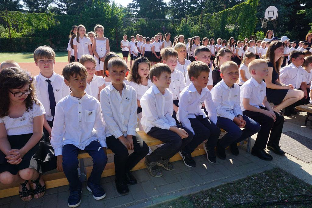 Az alsó tagozatos osztályoknak is rendhagyó módon az iskola műfüves pályáján tartottuk a tanévzáró ünnepélyt, melynek során kihirdetésre kerültek az iskolai jutalmak is. Az oklevél és könyv jutalmakat az iskola alsós közössége és szüleik előtt vehették át a tanulók, az oklevél jutalmakat a bizonyítványosztással együtt kaphatták meg a jutalmazottak. Az ünnepségen vehették át elismerő okleveleiket a Zrínyi matematika verseny díjazottjai is. Búcsúztunk két nyugdíjba vonuló pedagógusunktól, Kozma Györgyi és Németh Gyöngyi tanárnőktől.