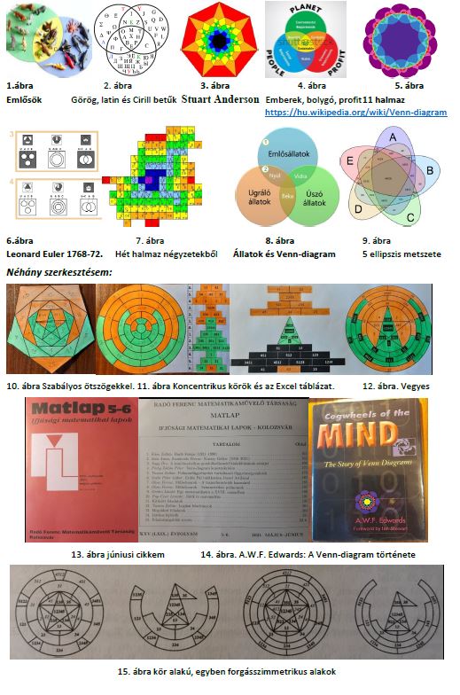 Halmazábra kutatásaimat 1992-ben kezdtem. Tanulmányaim során találkoztam bizonyos tulajdonságú elemek csoportjaival, összességével. Ezek közötti kapcsolatokat a halmazelméletben, halmazábrákkal szemléltetjük. Ezeket Venn-diagramoknak nevezzük. John Venn Angol matematikus nyomán lett népszerű és gyakorlatorientált. Síkban három körnél több metszet, az összes előálló részhalmazokkal nem ábrázolhatók. John Venn (1881) munkái nyomán lett népszerű és gyakorlatorientált. Vannak más utak is. A.W.F. Edwards, 2004 angol genetikus munkája egy teniszlabda felületén, a varrások mentén szemléltetett 2-9 halmazokat. A forgásszimmetria itt már csak a halmazalakoknál van jelen. Lewis Carroll irodalmár (Alice csodaországban), matematikus téglalapból felépülő diagramjai (1896). Vannak azonban olyanok, amelyek nem teljesítik a szimmetrikus Venn-diagramok tulajdonságait (David. W. Henderson 1963). B. Grünbaum a Venn-diagramok definiciója (1975). Jelenleg már a 11 és 13 halmaz forgásszimmetrikus diagram is publikálva.