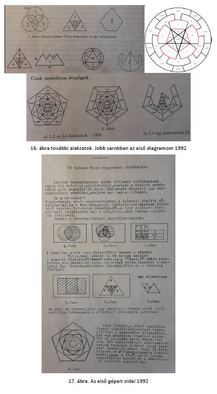 - Koncentrikuskörök rendszere, 2. Szabályos p (prím) szimmetrikus sokszögek rendszere, 3. Ezek vegyes rendszere 3, 5, és 7 halmazokra. 4. Legegyszerűbb Venn-diagramok, amikor a lehető legkevesebb körvonalat és szakaszat használok fel, hogy elhelyezzem az adott n-hez tartozó részhalmazokat. 5. A térbeli Venn-diagramok még gyermekcipőben vannak, egy ábra ismert. Ami a síkban nem szerkeszthető az a végtelen térben lehetséges lehet. Így készültek el a térbeli 6 és 8 halmazos szerkesztéseim. Fontos eszköze a munkámnak az Excel táblázat, mely segítségével tudtam a nagyobb prímekkel (5, 7, 11) könnyedén dolgozni (továbbá Word, PowerPoint, körző és vonalzó).
