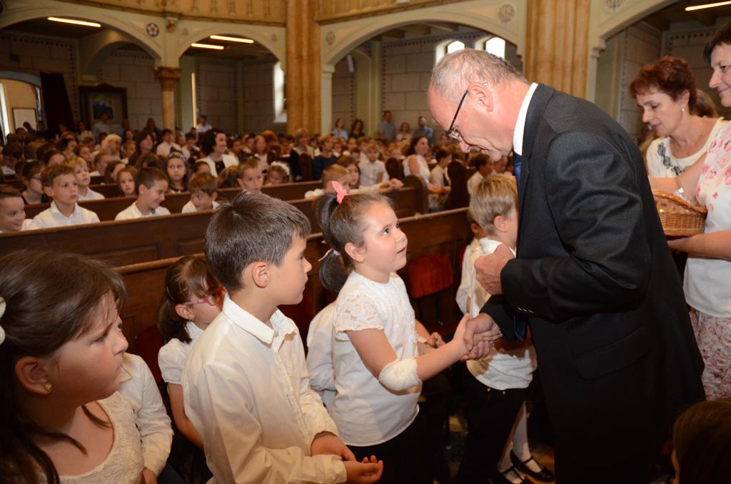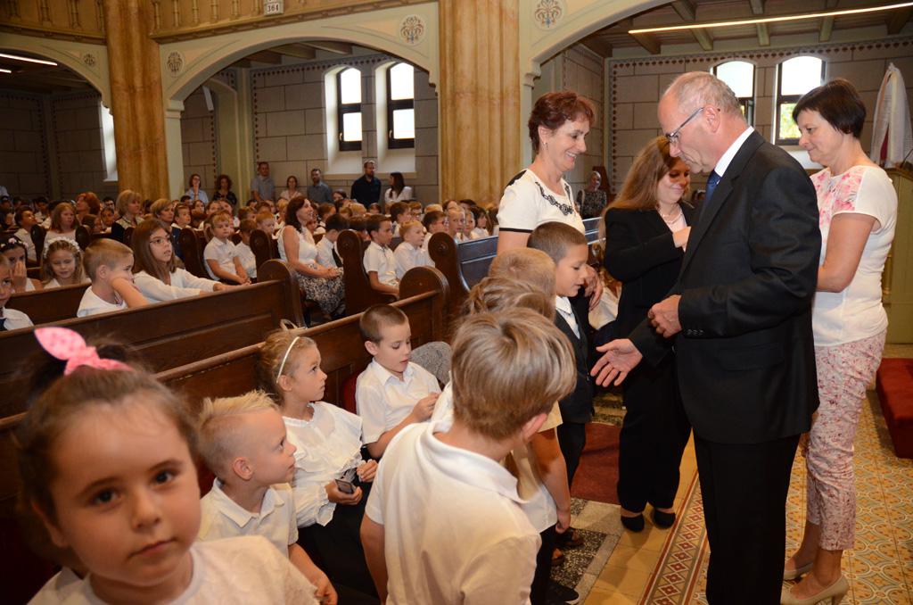 Sátory Károly igazgató köszöntötte a diákokat, s ismertette az intézmény új fejlesztési terveit, majd a kis elsősök átvehették az iskola jelvényét, a tanító nénik és az Evangélikus Nőegylet ajándékait.